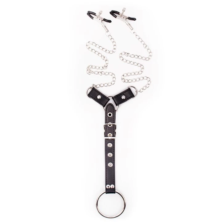 Pacify your obeying sub with the Dominator Faux Leather Chain Nipple Clamps & Cock Ring by Bondara.