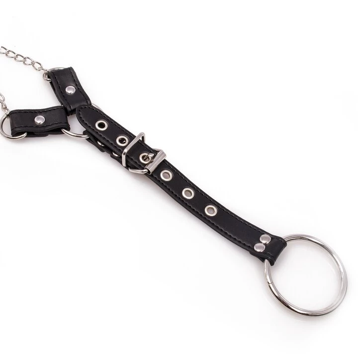 A fully adjustable faux leather strap extends downward from the mid-line toward the groin to enclose his cock in 50mm stainless steel ring for an amplified appearance. The C-ring will begin to tug the harness and on his nipples as his pathetic erection grows! The Dominator is the perfect way to let him know who’s boss