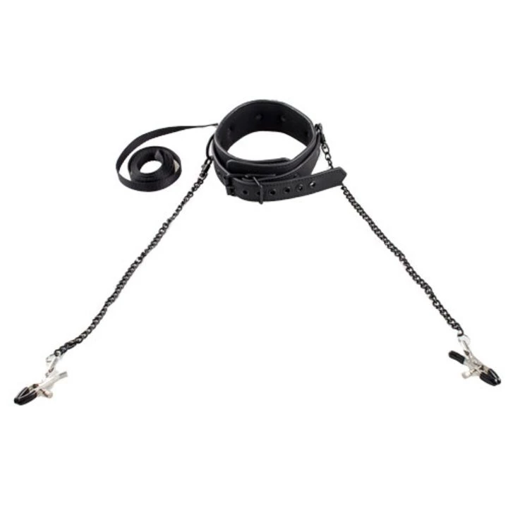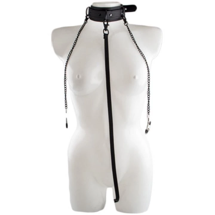 β’ Three-piece restraint includes a collar with a detachable leash and nipple clamps