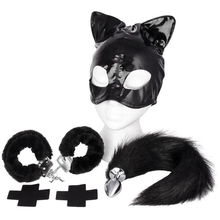β’ Includes a Wet Look Cat Mask, Black Tail Butt Plug, Black Cross Nipple Pasties, and Black Faux Fur Metal Handcuffs